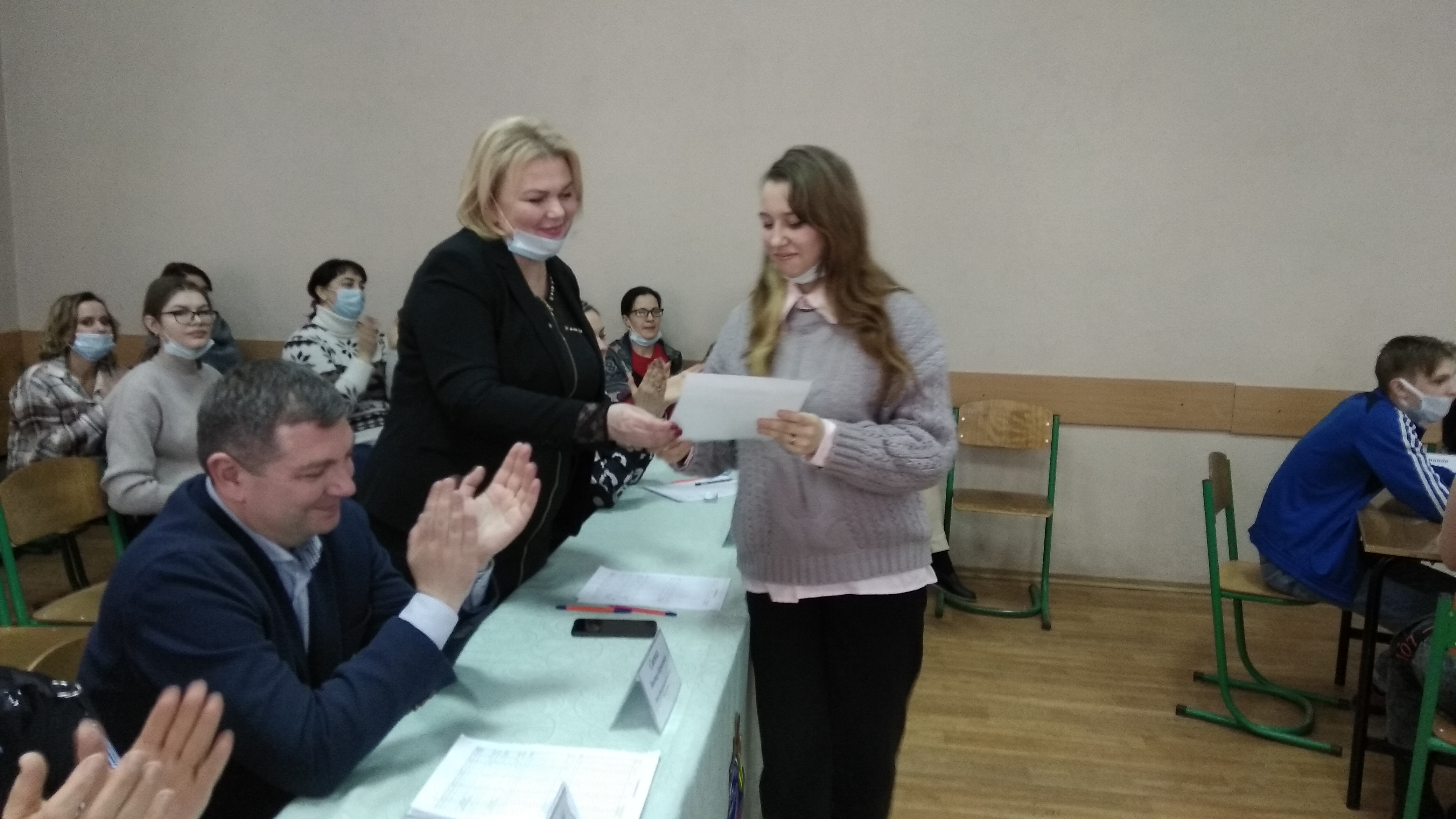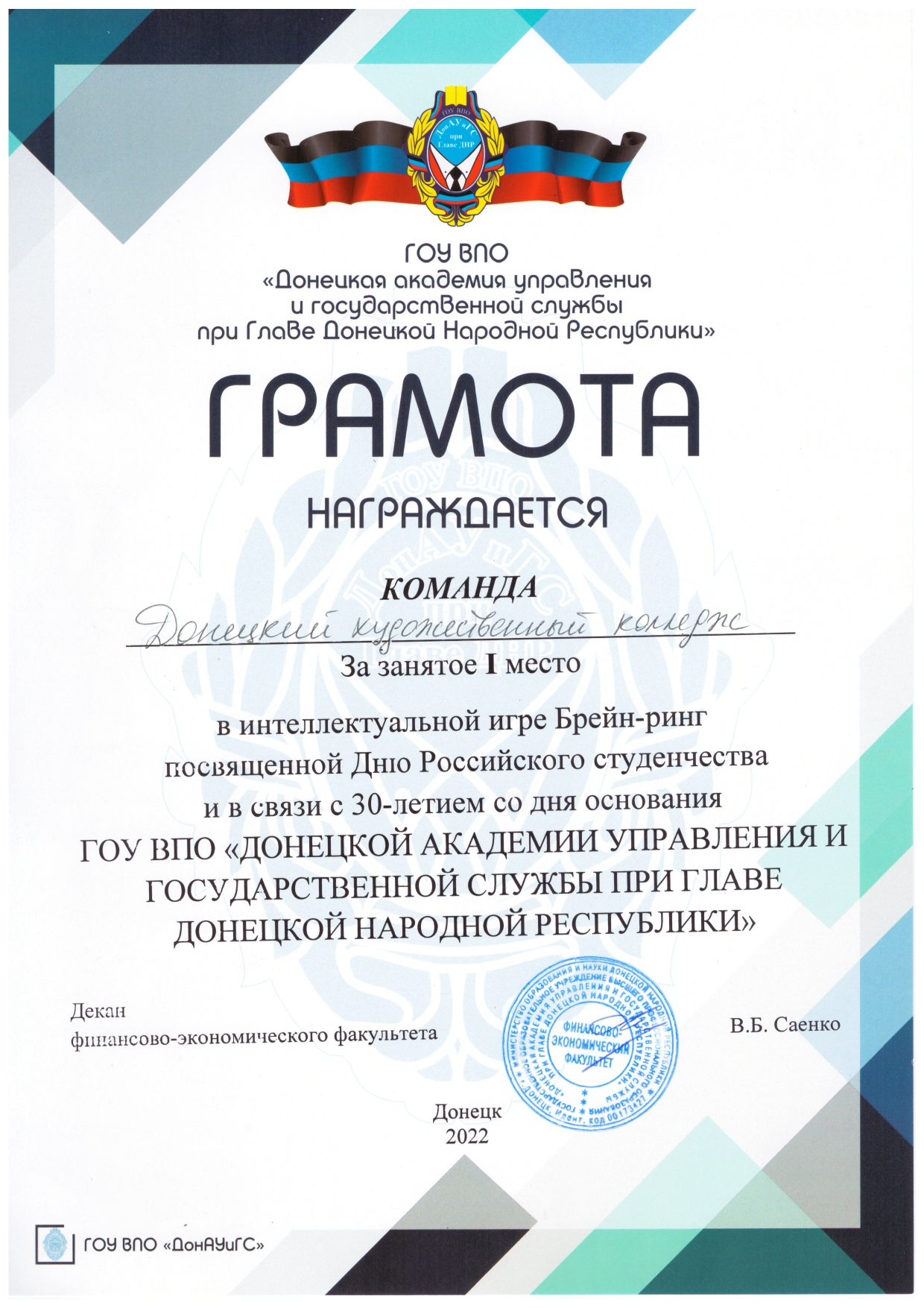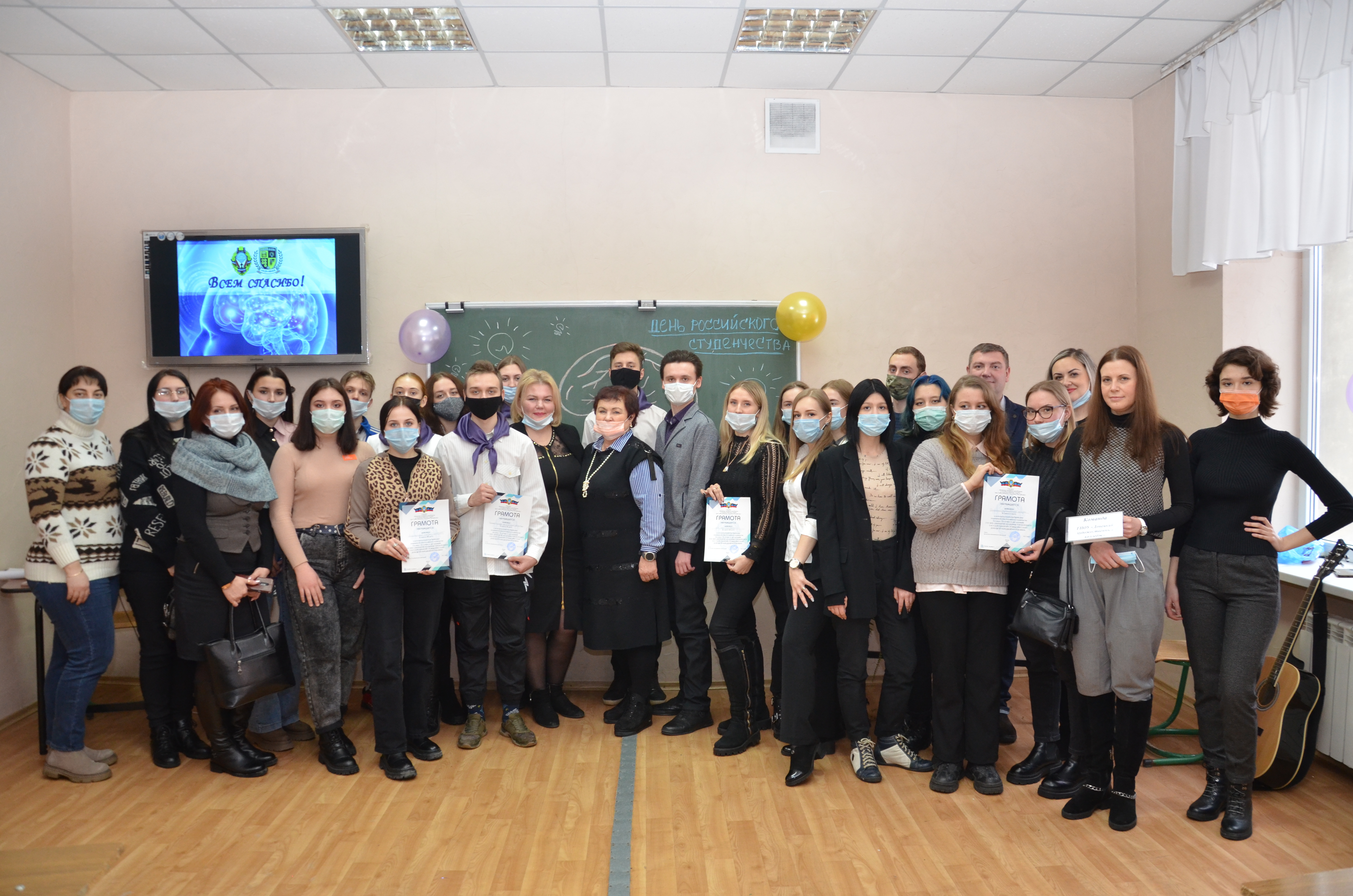 25 января команда из студентов 1-3 курсов ГПОУ «ДХК» и заместитель директора по воспитательной работе Ванина Н.В. посетили ГОУ ВПО «ДОНЕЦКАЯ АКАДЕМИЯ УПРАВЛЕНИЯ И ГОССУДАРСТВЕННОЙ СЛУЖБЫ ПРИ ГЛАВЕ ДОНЕЦКОЙ НАРОДНОЙ РЕСПУБЛИКИ» с целью участия в интеллектуальной игре брейн-ринг, посвященной Дню Российского студенчества. Состязания состояли из четырех раундов (вопросы и ребусы по обществознанию, музыкальные конкурсы, музыкальный «крокодил»). В Брейн-ринге принимали участие команды из образовательных учреждений среднего и высшего образования. Студенты колледжа показали высокий уровень интеллектуального развития, быстроту реакции и смекалку, командный дух. Поздравляем Алпатову Юлию (3/1Д), Рябову Анну (2/2Д), Иващенко Марию (2/1Д), Арутюнян Анжелу (1/3Д), Ковалевскую Софию (1/3Д) с занятым I местом в командном состязании.