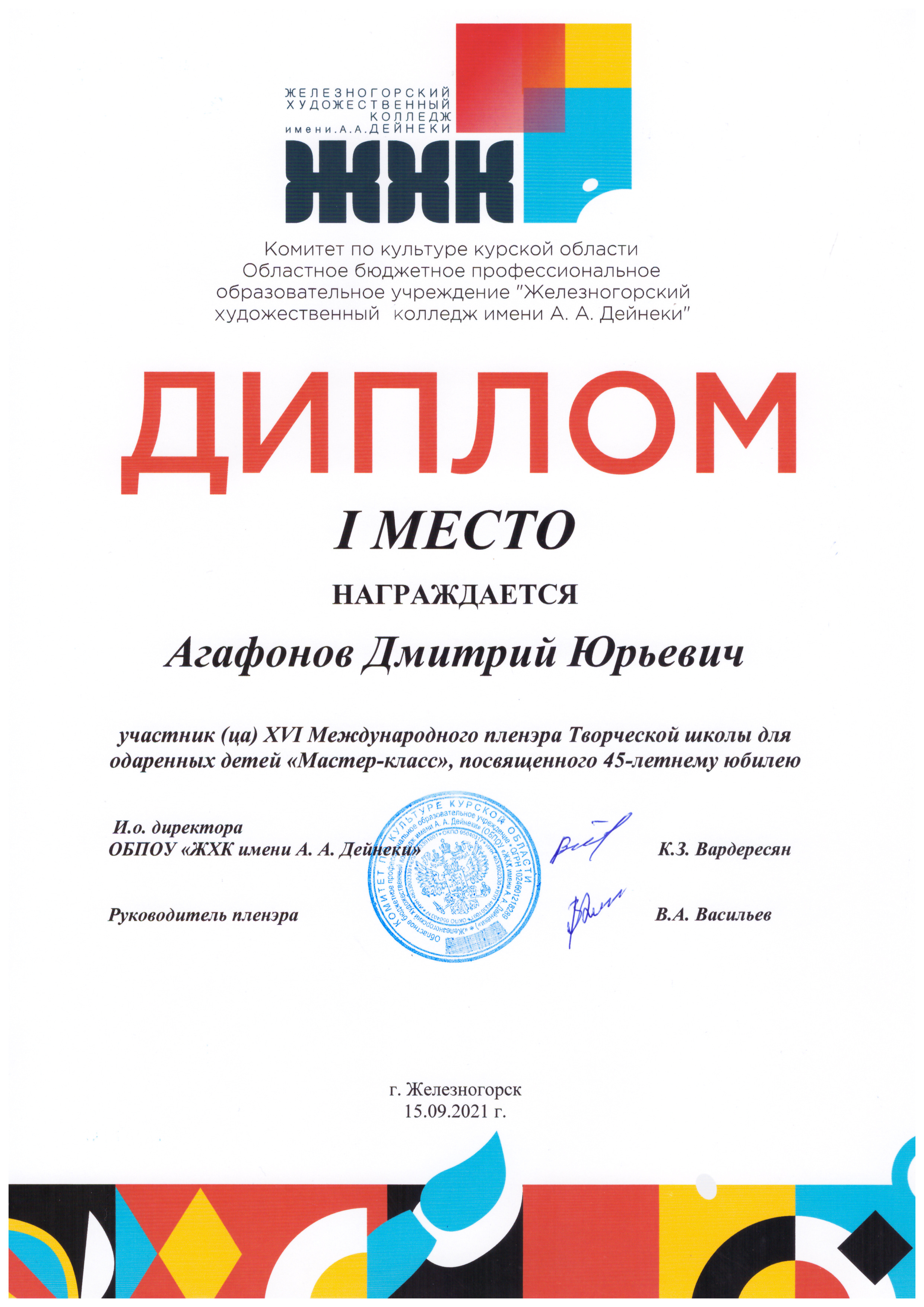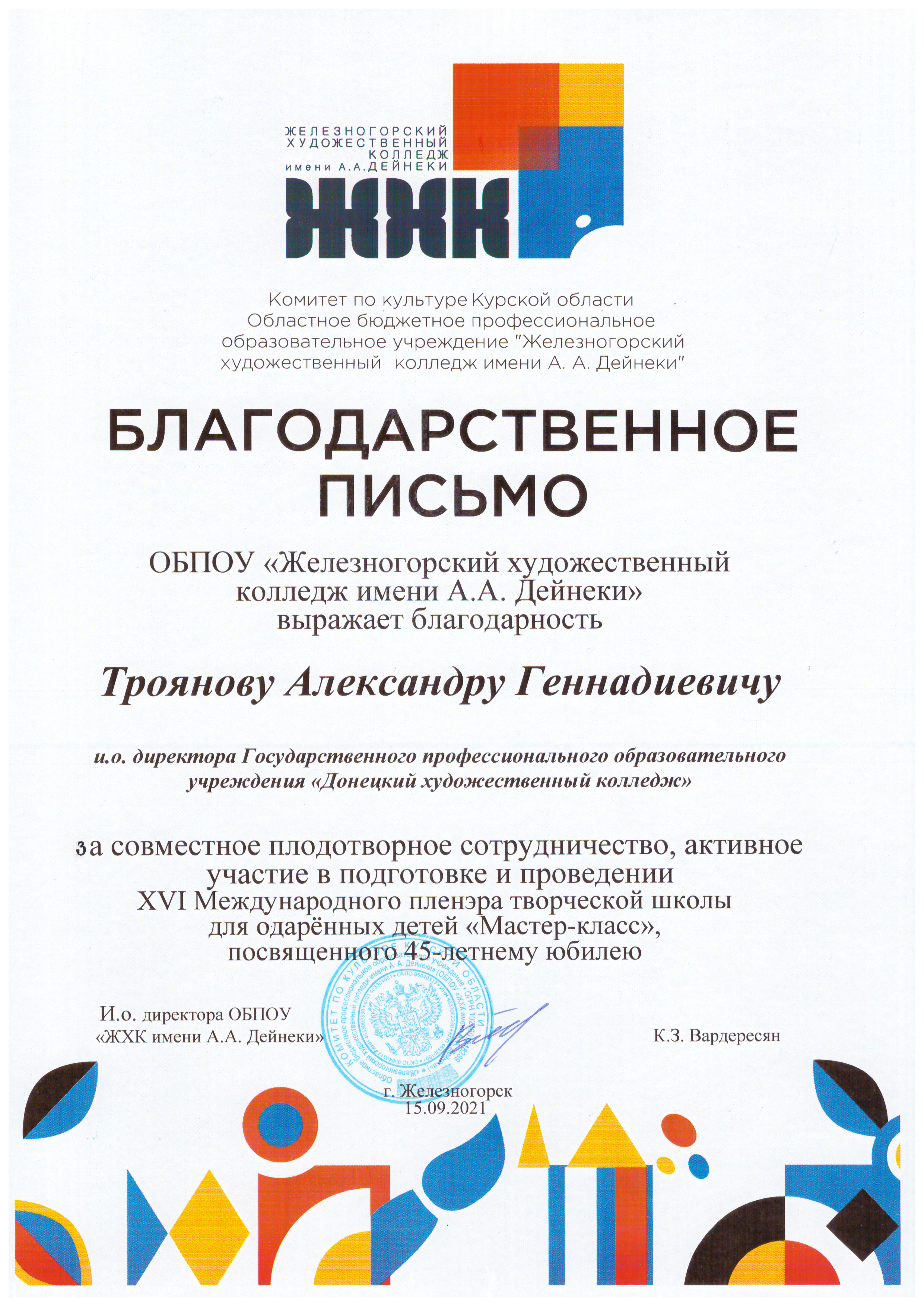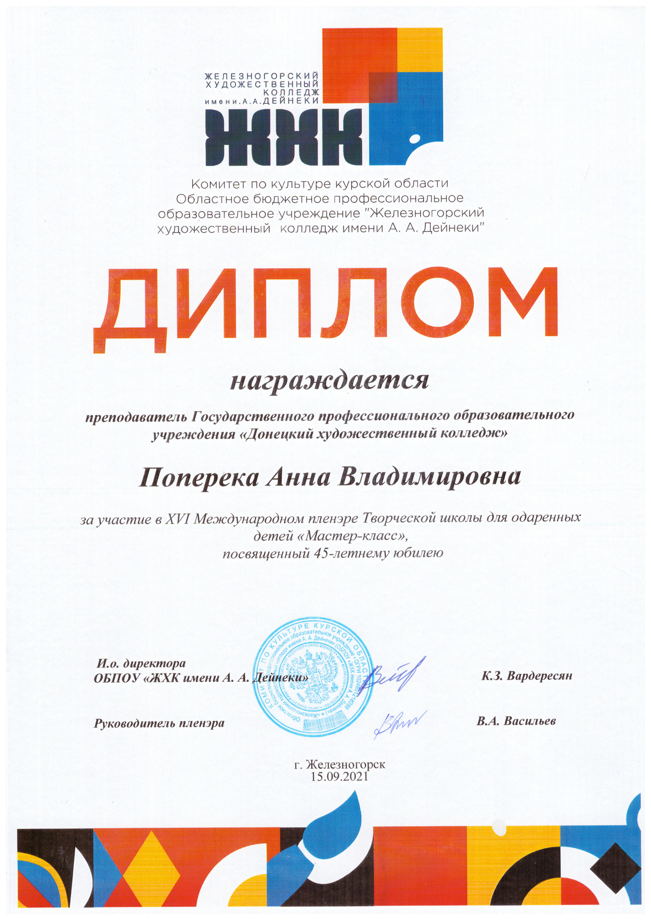 В 2021 году студенты Донецкого художественного колледжа Агафонов Дмитрий и Ивахненко Владислав вместе с молодыми коллегами из Гомельского художественного колледжа и Железногорского художественного колледжа имени А.А. Дейнеки приняли участие в XVI Международном пленэре Творческой школы для одарённых детей «Мастер-класс» (г. Железногорск, Курская область, РФ).