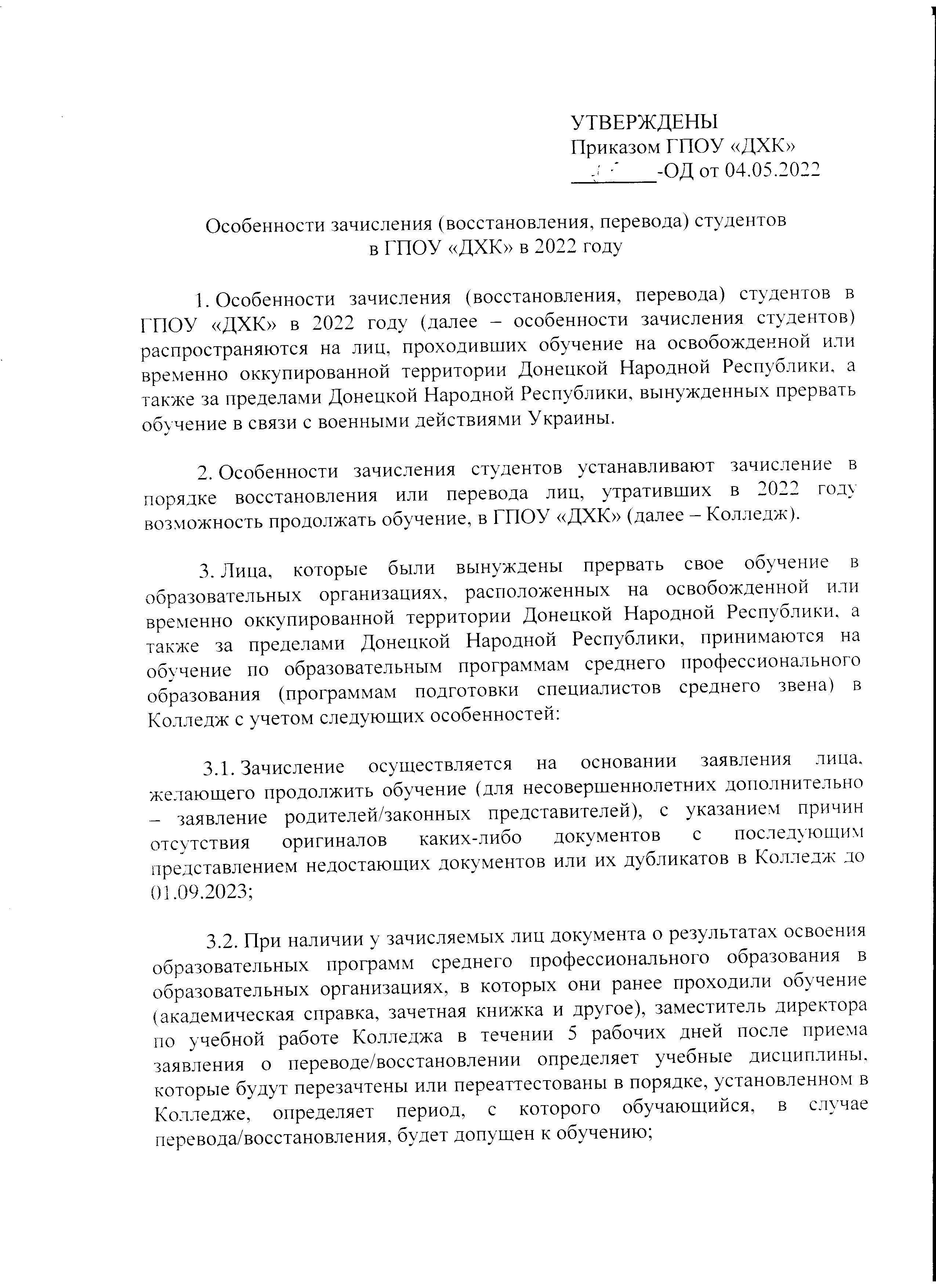 Особенности зачисления (восстановления, перевода) студентов в ГПОУ «ДХК» в 2022 году