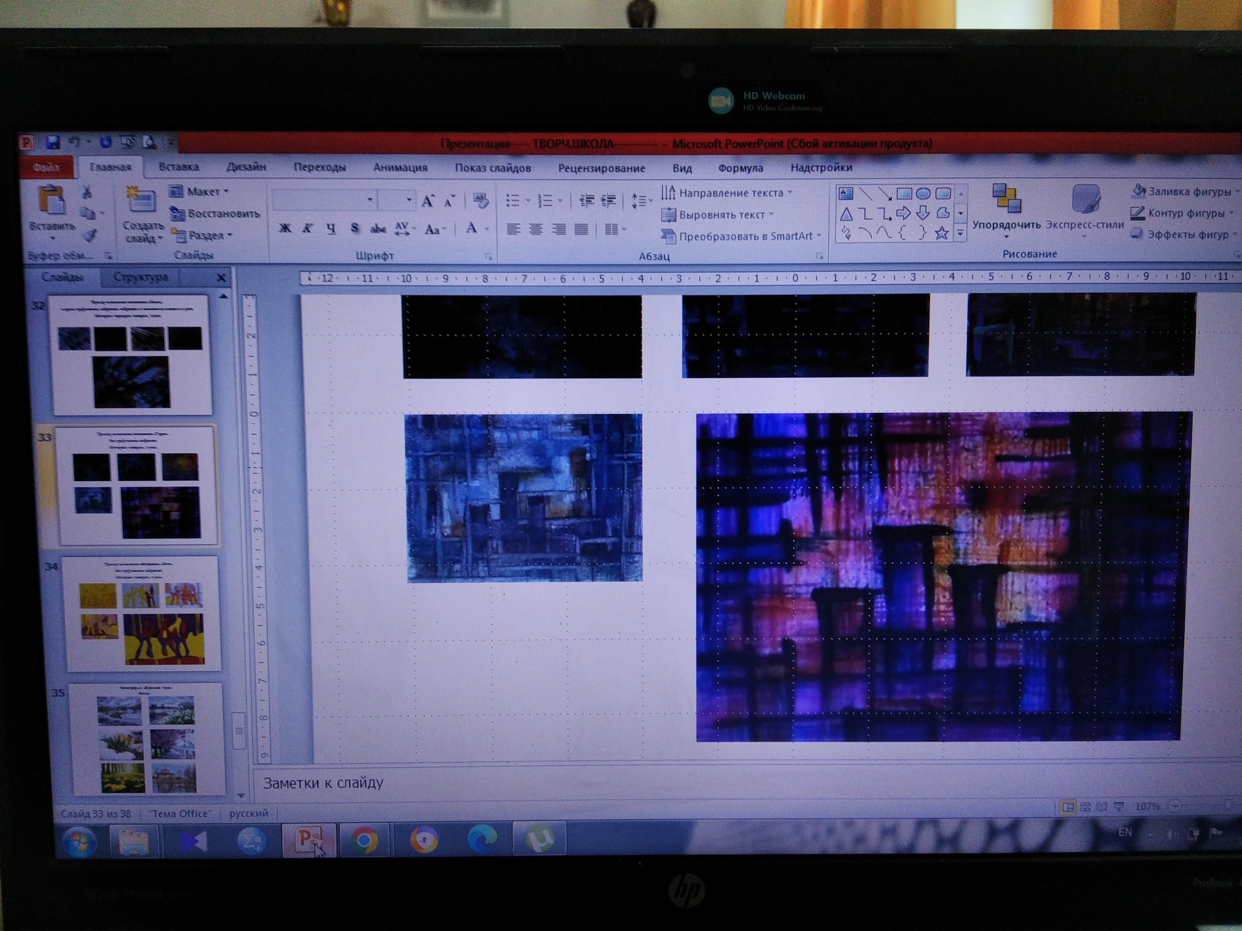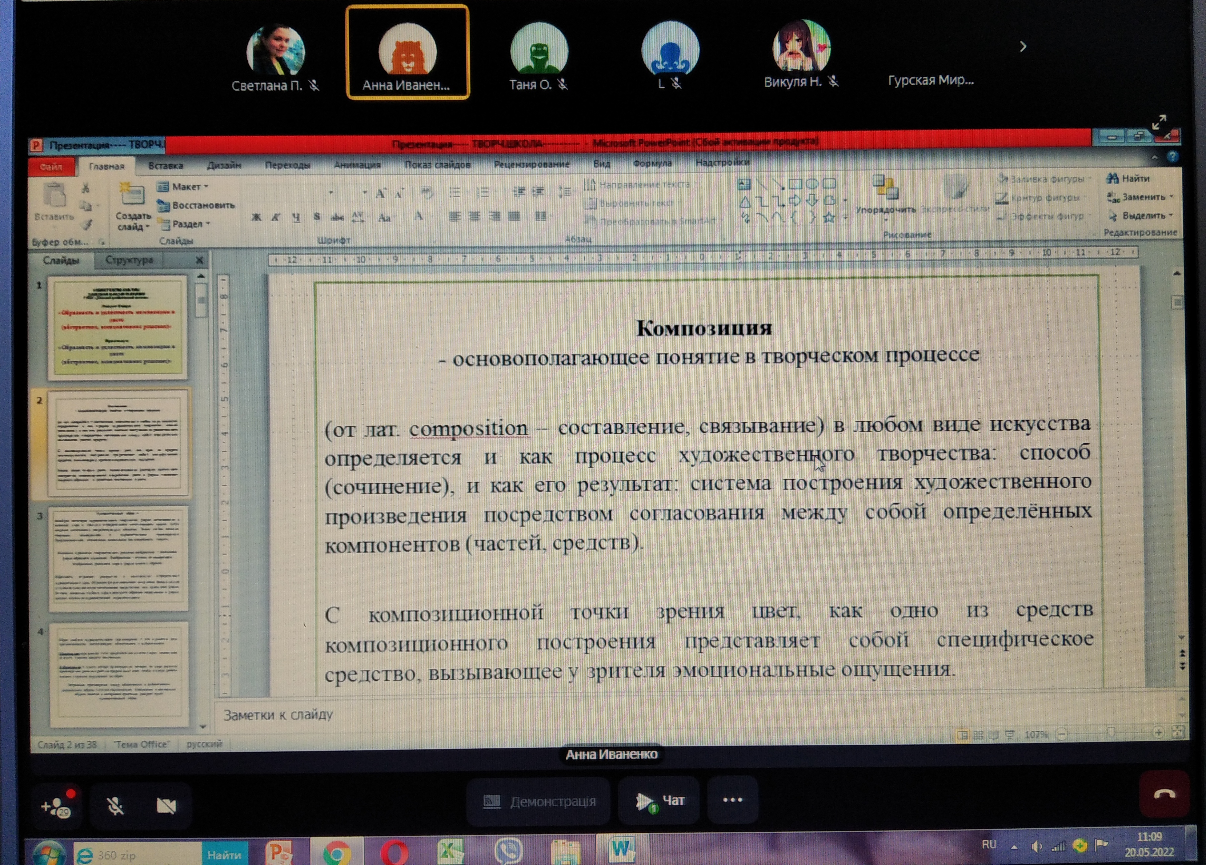 В ходе занятий Нина Николаевна раскрыла понятия композиции и художественного образа. Лектор актуализировала знания слушателей о художественной природе цвета. Особое внимание было уделено абстракции и ассоциации как путям создания художественного образа, роли цвета в разработке ассоциативной композиции. Теоретические тезисы были проиллюстрированы примерами работ из методического фонда Донецкого художественного колледжа.