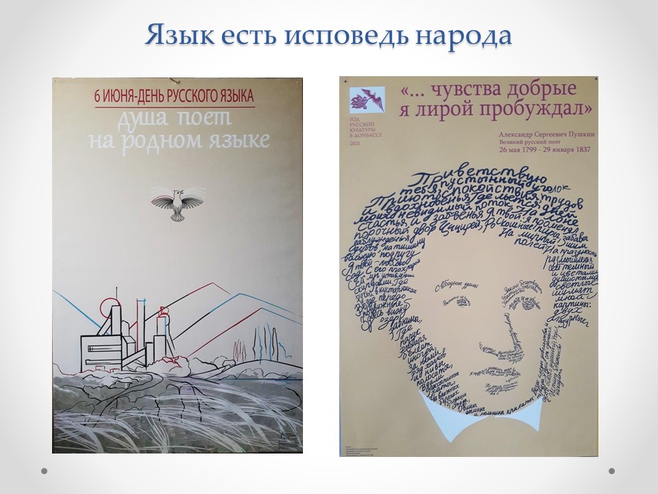 6 июня 2022 года в Донецком художественном колледже состоялись мультимедийная выставка плакатов "Язык есть исповедь народа" и книжная выставка, посвящённые Дню русского языка. Организатор мероприятий – библиотекарь Сушко Т.В. Плакаты разработаны студентами колледжа под руководством преподавателя Рязанова В.И. Выставка плакатов также приурочена к Году молодёжи в Донецкой Народной Республике.