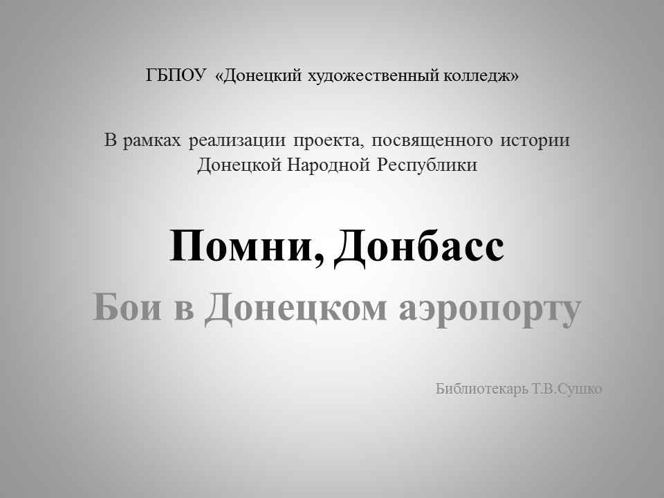 В рамках реализации проекта, посвящённого истории Донецкой Народной Республики «Помни, Донбасс» предлагаем вспомнить трагическую страницу нашей истории – бои за Донецкий аэропорт, кульминация которых пришлась на январь 2015 года. Мультимедийный проект подготовила библиотекарь Донецкого художественного колледжа Сушко Т.В.