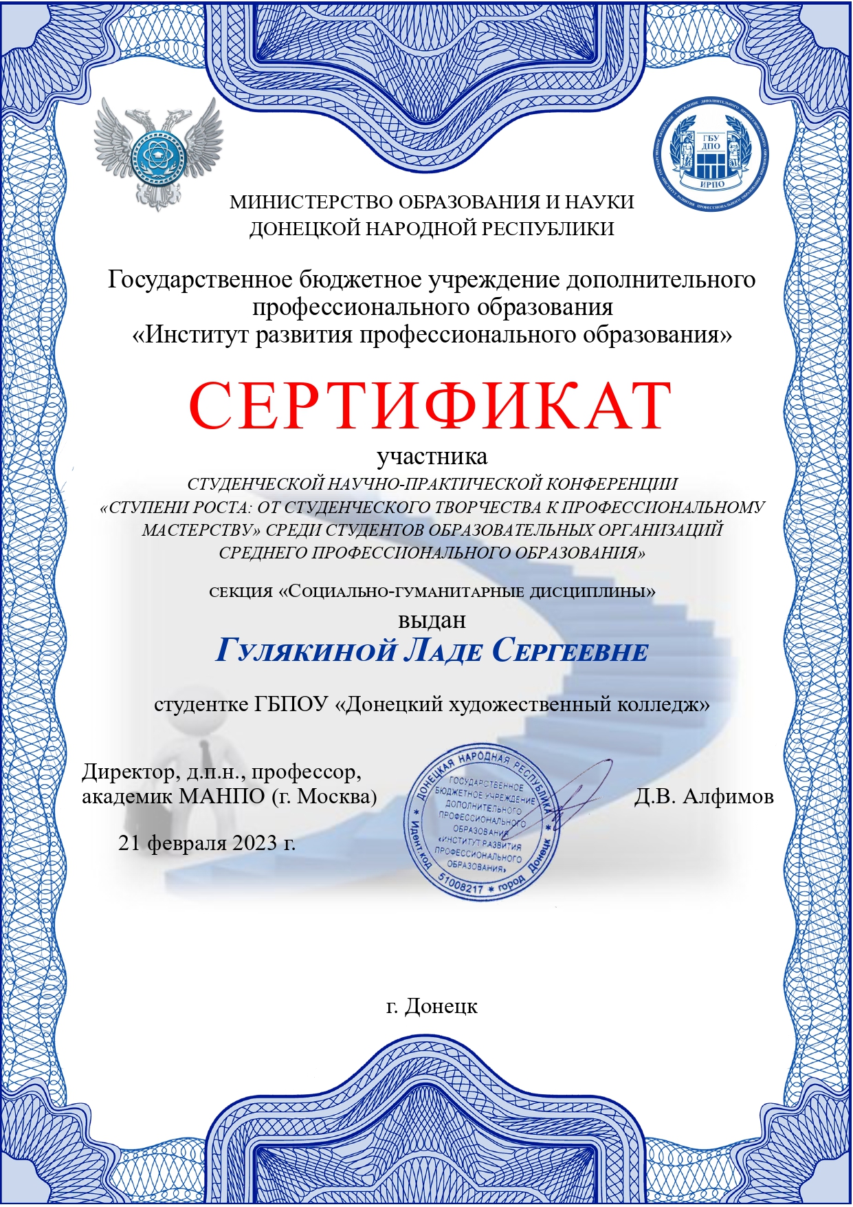 Студенты Донецкого художественного колледжа приняли участие в Студенческой научно-практической конференции «Ступени роста: от студенческого творчества к профессиональному мастерству» среди обучающихся профессиональных образовательных организаций системы среднего профессионального образования. Мероприятие организовано Институтом развития профессионального образования.