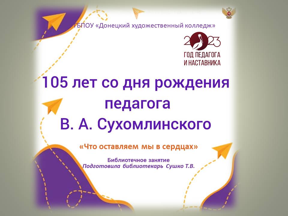 28 сентября 2023 года исполняется 105 лет со дня рождения выдающегося советского педагога Василия Александровича Сухомлинского. Представляем вашему вниманию материалы библиотечного занятия "Что оставляем мы в сердцах", посвящённого знаменательной дате.