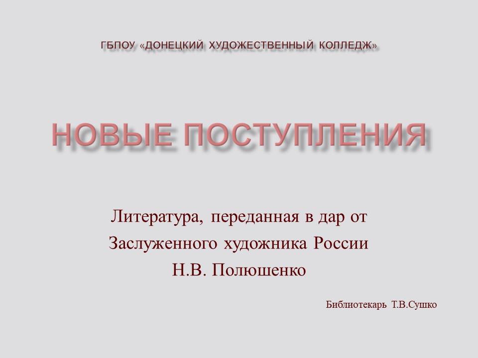 Заслуженный художник России Николай Полюшенко передал в дар Донецкому художественному колледжу печатные издания своих творческих работ. Благодарим автора за ценный дар и представляем мультимедийную выставку изданий, которые пополнили фонд библиотеки колледжа.