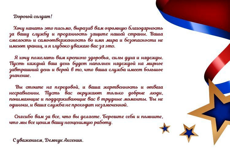 Студенты Донецкого художественного колледжа приняли участие во Всероссийской акции «Письмо солдату». В своих посланиях военнослужащим, участникам специальной военной операции, дети передавали слова поддержки и благодарности за нелегкую военную службу, героизм и мужество в защите нашей Родины. В письмах они тепло поздравляли наших дорогих бойцов с приближающимся праздником 23 феврали и желали скорейшего возвращения с Победой домой.