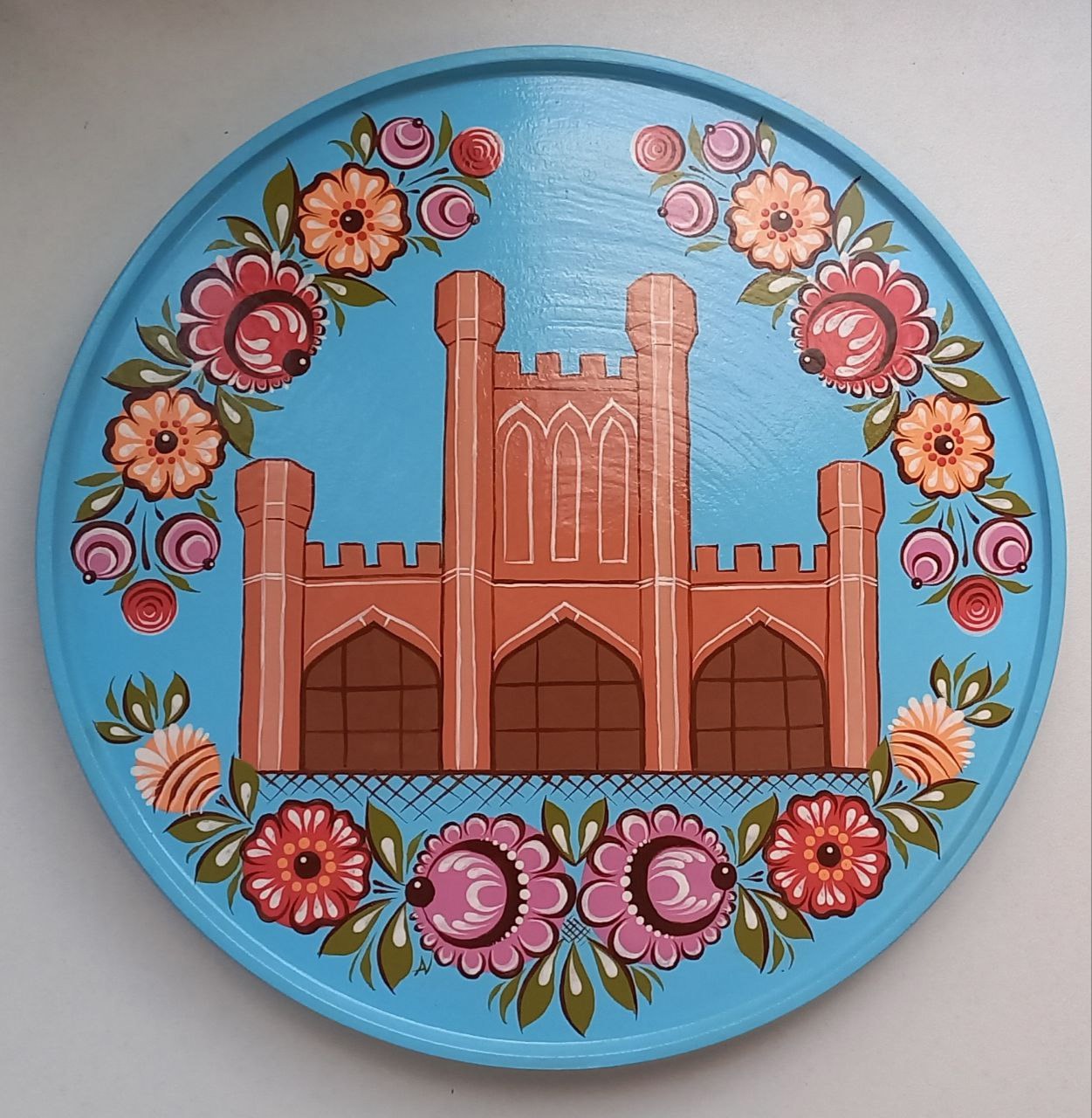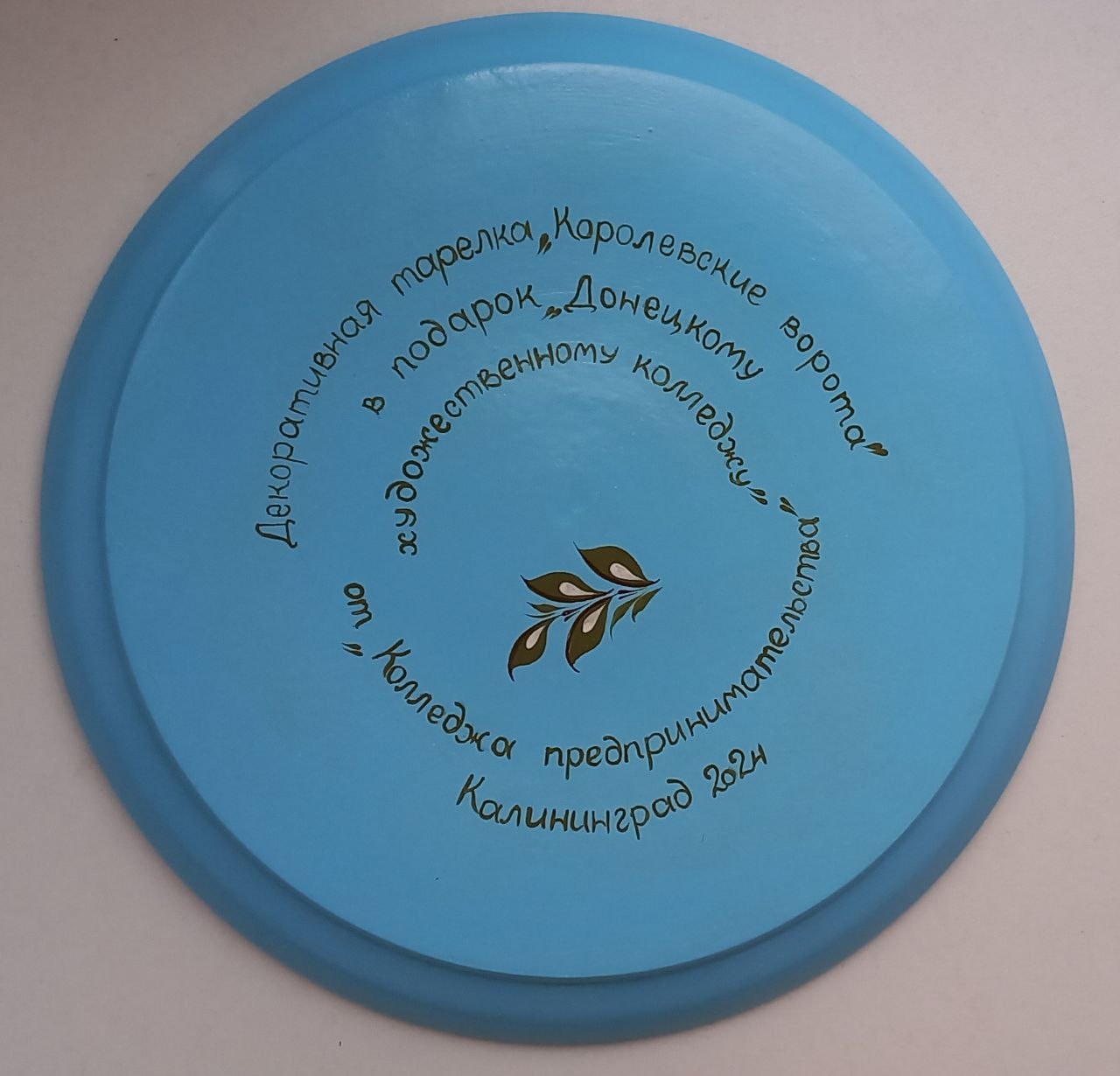 Первичное отделение Движения первых Колледжа предпринимательства подарило донецким друзьям деревянную тарелку с росписью, выполненную студентами специальности «Художник миниатюрной росписи». На ней изображены Королевские ворота - один из самых значительных памятников крепости Кёнигсберг, достопримечательность Калининграда.